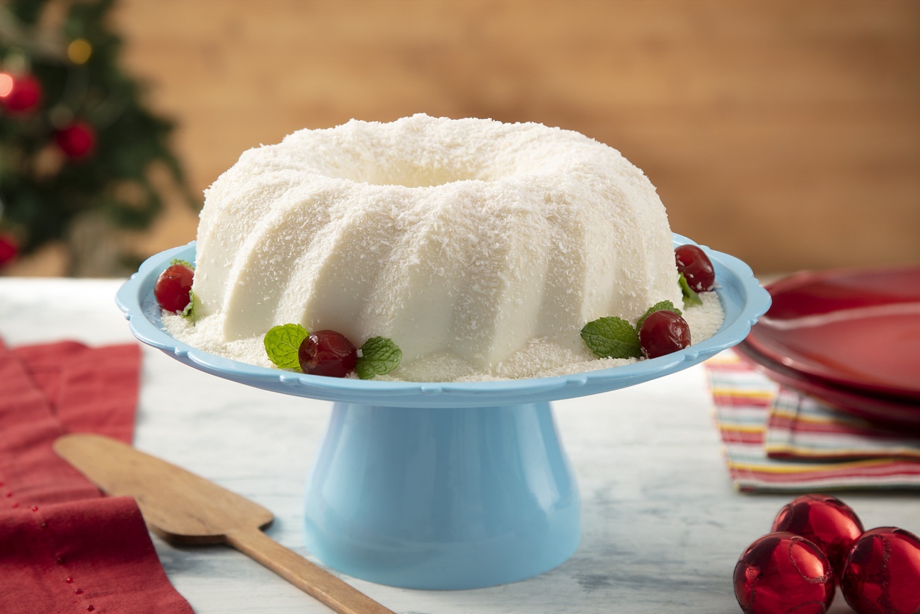 - Transfira para uma forma redonda de furo central (22 cm de diâmetro), untada com óleo ou manteiga, cubra com plástico-filme e leve à geladeira por no mínimo 3 horas. Desenforme, finalize com o coco ralado e sirva.