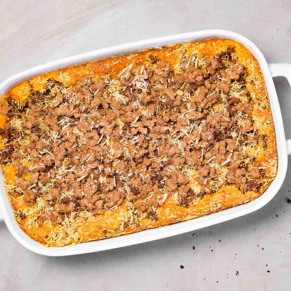 - Para começar, em uma panela grande, refogue a carne moída com a manteiga até que fique bem douradinha. Adicione o alho, o extrato de tomate e o molho de soja, e refogue até que seque bem. Em seguida, junte o requeijão e misture para incorporar. Deixe esfriar e reserve para usar como recheio.