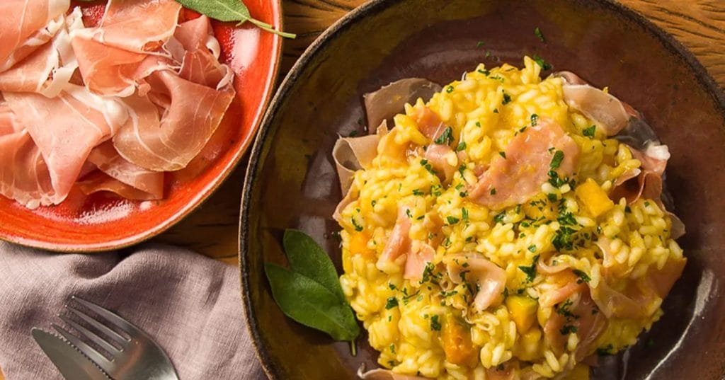 - Por fim, desligue o fogo e adicione a manteiga gelada, as fatias de Presunto Cru rasgadas e as folhas de sálvia picada à panela. Misture tudo bem e sirva o risoto quente, aproveitando a combinação dos sabores e texturas.