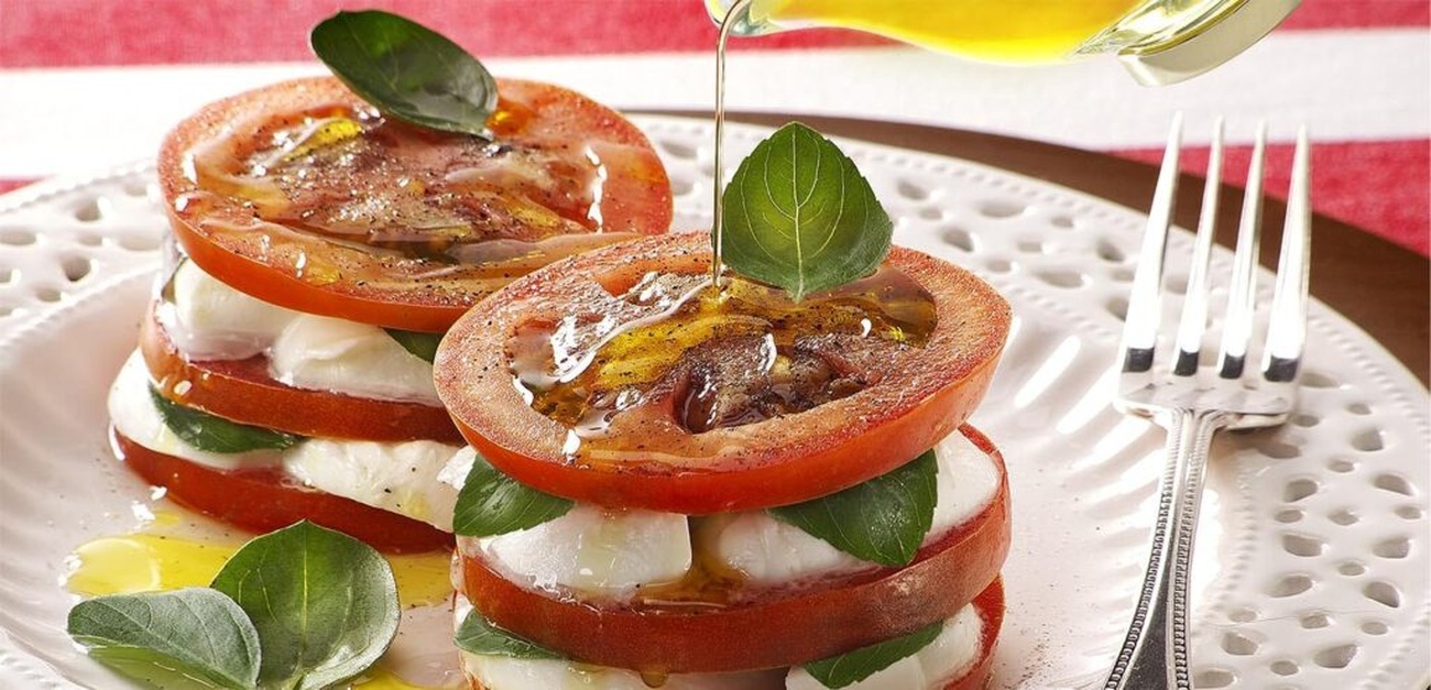 - Em um prato individual, comece colocando uma rodela de tomate, seguida de uma rodela de muçarela de búfala e finalize com algumas folhas de manjericão. Repita esse processo até que todos os ingredientes sejam utilizados, criando camadas de sabores e texturas.