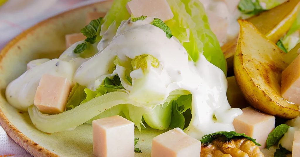 - Sobre as saladas, distribua os cubos de peito de frango, as nozes e regue com o molho. Finalize com algumas folhas de hortelã. Sirva imediatamente e aproveite a combinação de sabores e texturas.