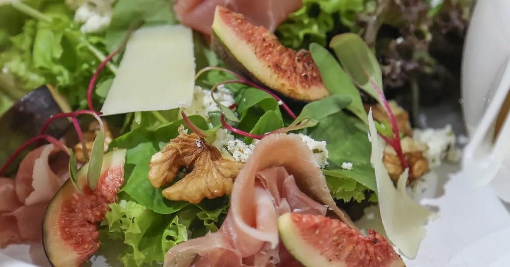 - Coloque o figo, o presunto, a ricota, e as nozes dispondo de forma decorada no prato.