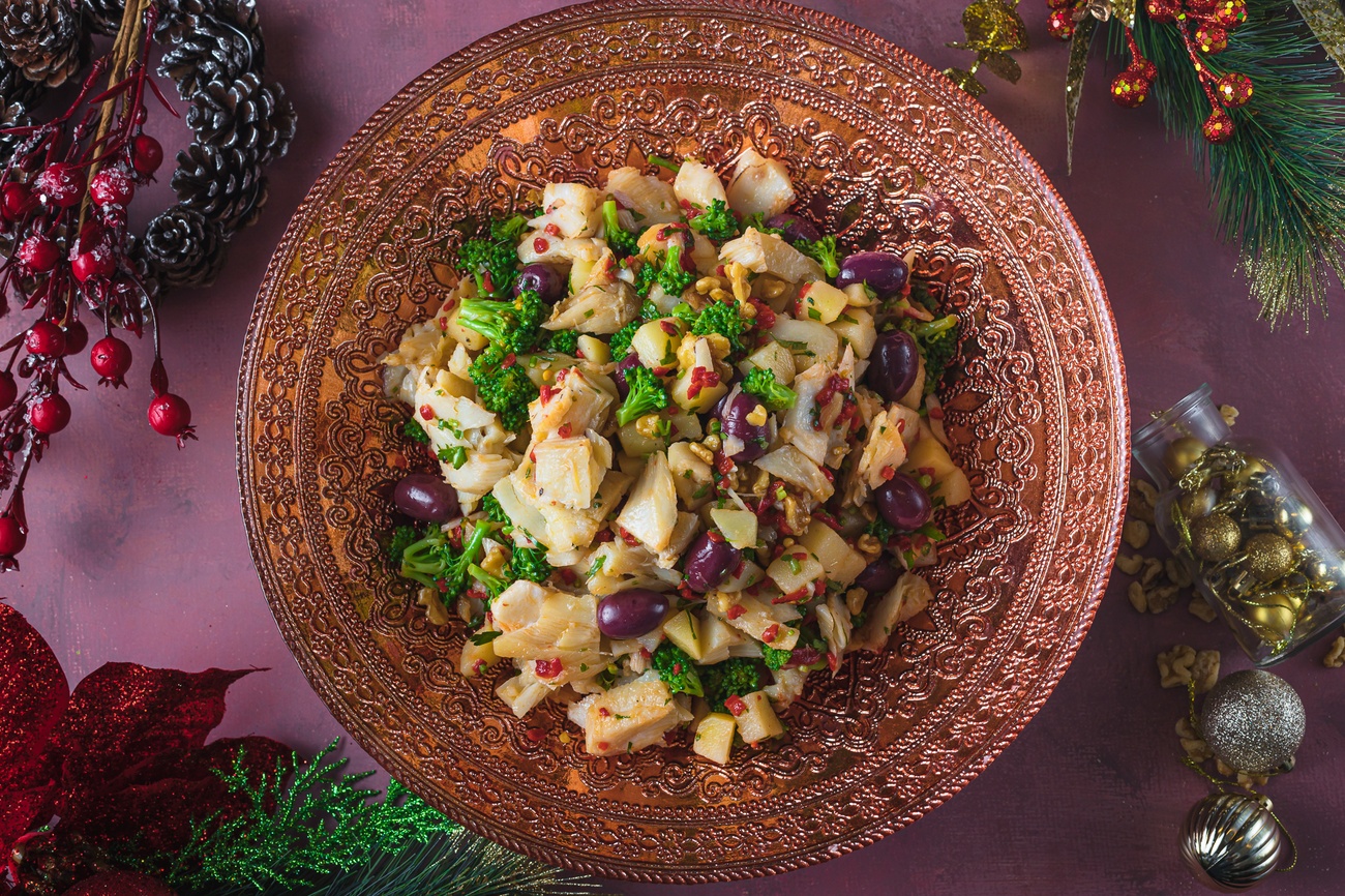 - Em um recipiente, comece misturando o bacalhau desfiado, as batatas cozidas em cubos, os pimentões sem pele e sem sementes, as azeitonas pretas, a cebola roxa picadinha e o brócolis cozido. Essa combinação já promete uma explosão de sabores e texturas.