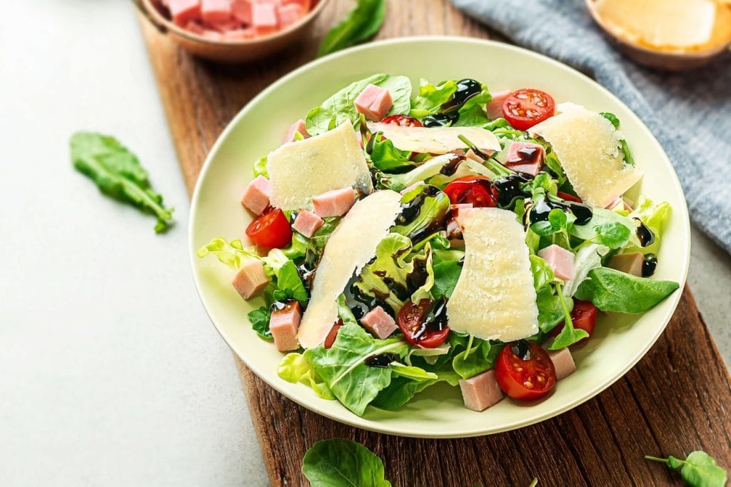 - Junte o presunto em cubos e o queijo parmeso em lascas salada e misture tudo com cuidado para que os ingredientes se integrem harmoniosamente.