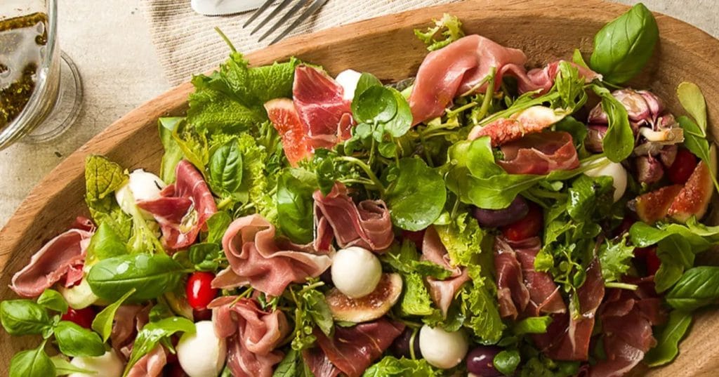 - Por cima das trouxas de presunto, adicione os figos cortados, os tomatinhos cereja, as azeitonas pretas e as bolinhas de mussarela de búfala. Finalize com folhas de manjericão basílico para dar um toque de cor e frescor. Reserve a salada para adicionar o molho mais tarde.