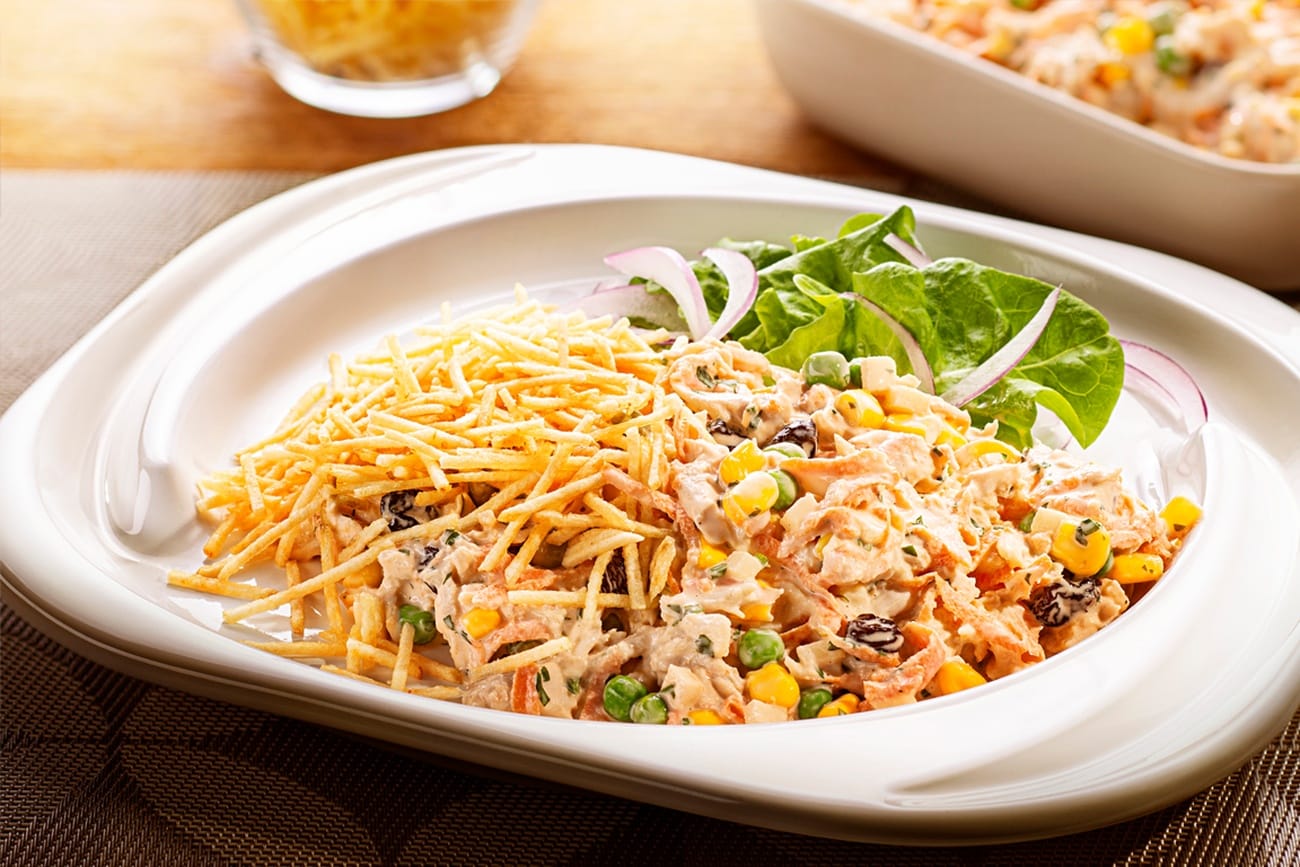 - No momento de servir, misture a batata palha para manter a crocncia.