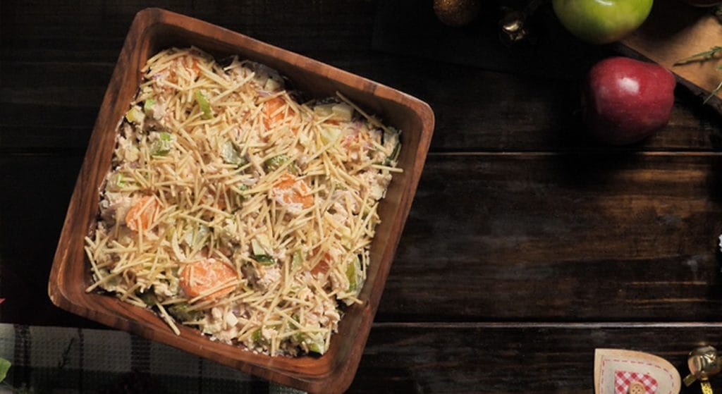 Para um toque especial, adicione uma colher de sopa de mostarda à mistura de frango. Isso dará um sabor ligeiramente picante e mais complexo ao seu Salpicão de Natal com Frango Defumado. Além disso, mantenha o prato em temperatura ambiente por cerca de 15 minutos antes de servir para que os sabores se equilibrem.