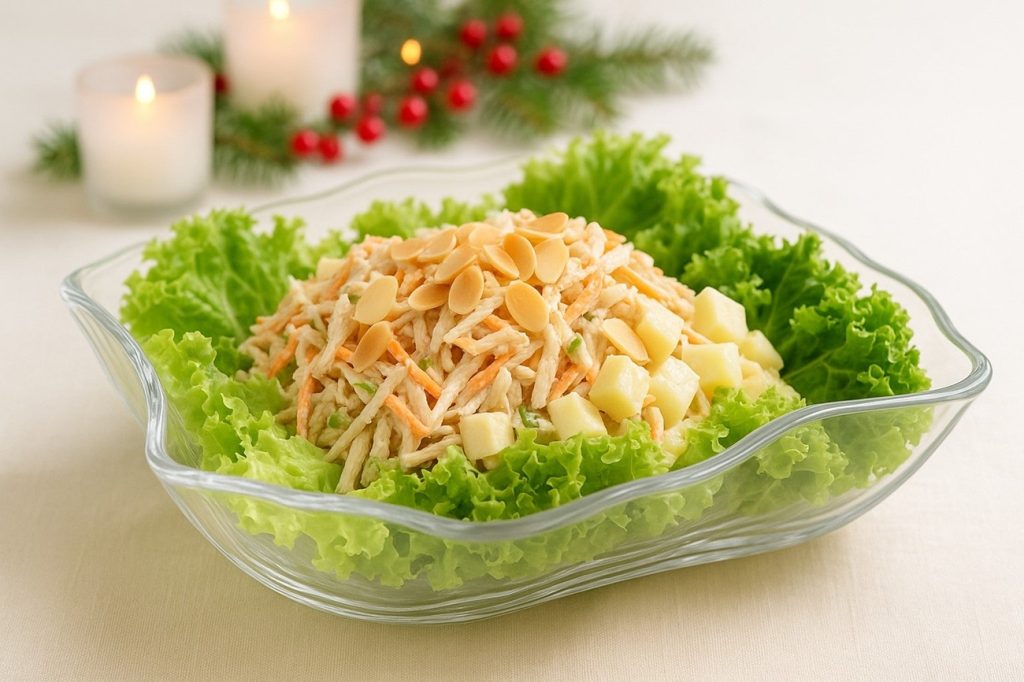 - Com todos os ingredientes bem incorporados, coloque a mistura em uma saladeira. Para finalizar, distribua as lascas de amêndoas tostadas por cima do salpicão, adicionando uma textura crocante e um toque de sabor nutrido.
