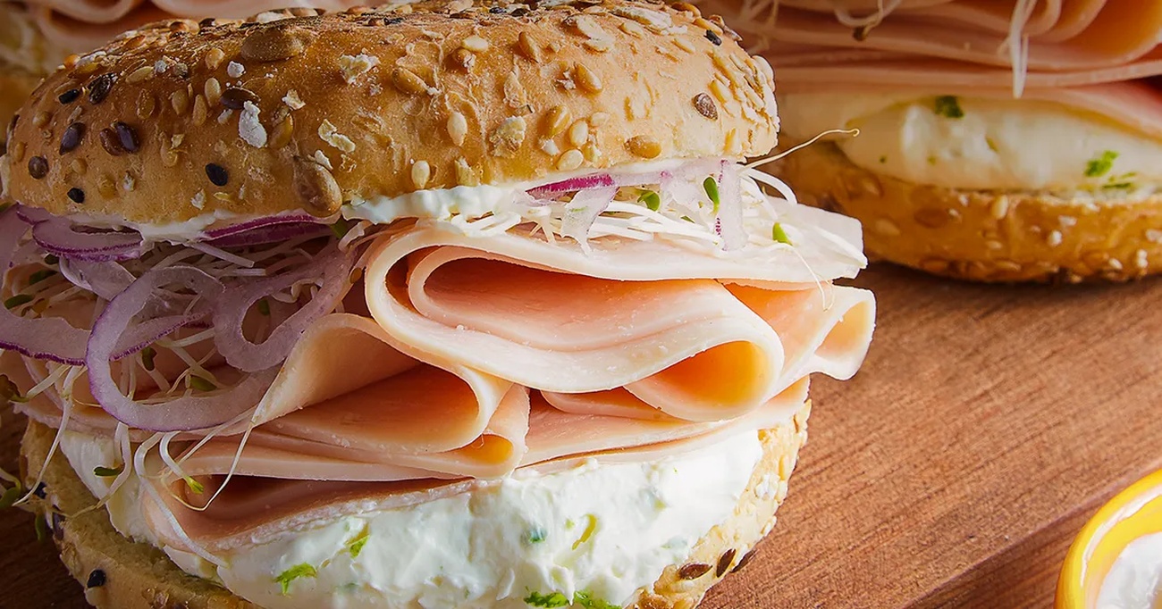 - Agora, abra os pães e monte os sanduíches. Coloque uma camada generosa de creme azedo em cada metade do pão, seguida por 3 fatias de peito de peru. Adicione os brotos de alfafa ou folhas verdes de sua preferência e finalize com as tiras de cebola roxa. A combinação de texturas e sabores é o que torna este sanduíche realmente especial.