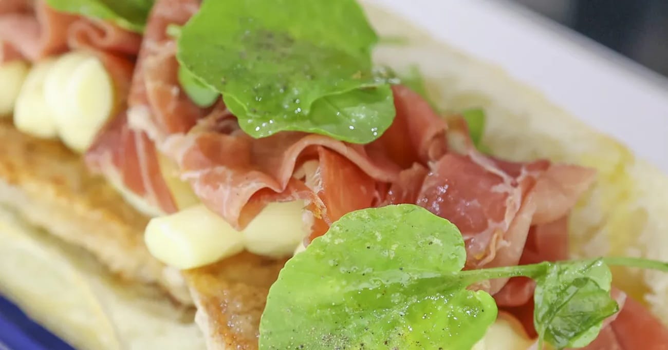 - Agora, é hora de montar o sanduíche. Abra a ciabatta e coloque os bifes de alcatra na base do pão. Cubra com o molho da frigideira, adicionando fatias de queijo mozzarela, fatias de Presunto tipo Parma e as baby leafs temperadas. Finalize cobrindo com a coroa do pão.