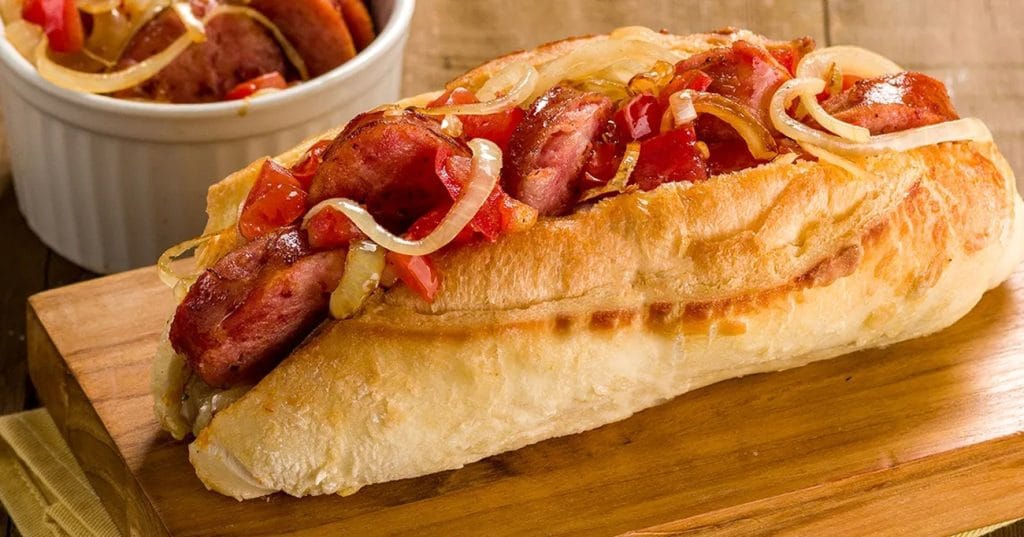 - Corte o pão semi-italiano ao meio e recheie com a linguiça tipo calabresa acebolada.