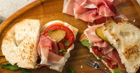 - Feche o sanduíche com a outra metade da ciabatta. Pressione levemente para que os ingredientes fiquem bem distribuídos.