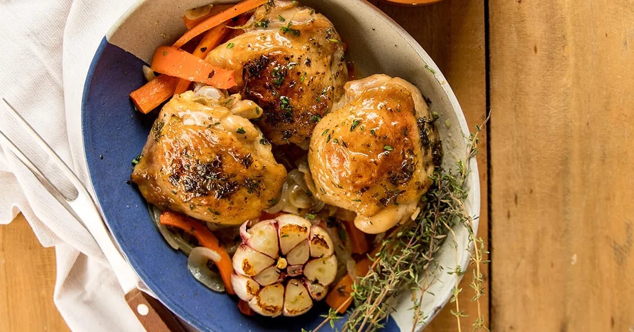 - Por fim, sirva as sobrecoxas com os vegetais e o alho assado. Aproveite!