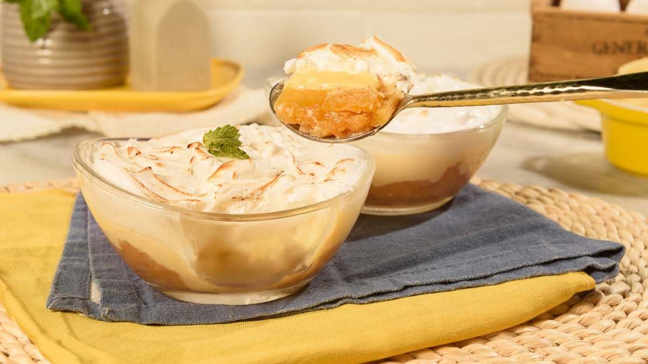 - Para montar a sobremesa, coloque uma camada de abacaxi caramelizado no fundo de um recipiente, seguida de uma camada de creme de leite condensado e, por fim, uma camada de cobertura de chantilly.