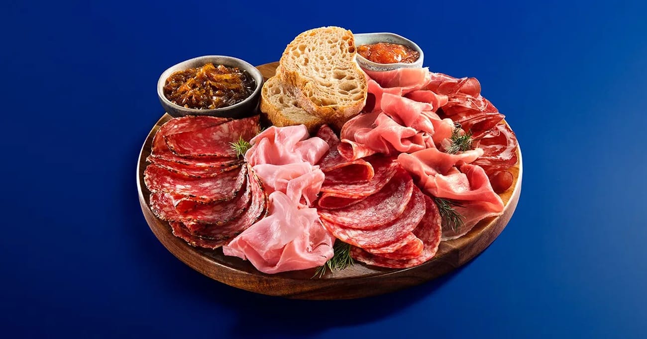 - Disponha o Presunto Royale, o Salame hamburguês, o Salame com Borda de Pimenta e a Copa em uma tábua redonda.