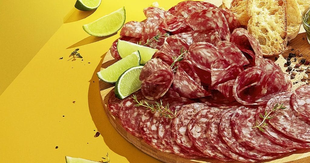 - Disponha as fatias de salame em uma tábua de apresentação, deixando um pouco de espaço entre elas para uma distribuição harmoniosa. Em seguida, distribua as rodelas de limão entre as fatias de salame, criando um contraste visual atraente.