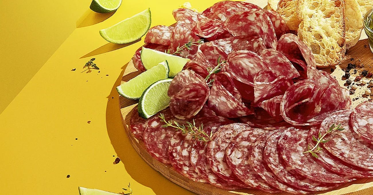 - Para começar, fatie o salame em rodelas finas, tentando manter todas elas do mesmo tamanho para uma apresentação uniforme. Em seguida, corte os limões Taiti em rodelas finas, aproveitando ao máximo seu suco e frescor.