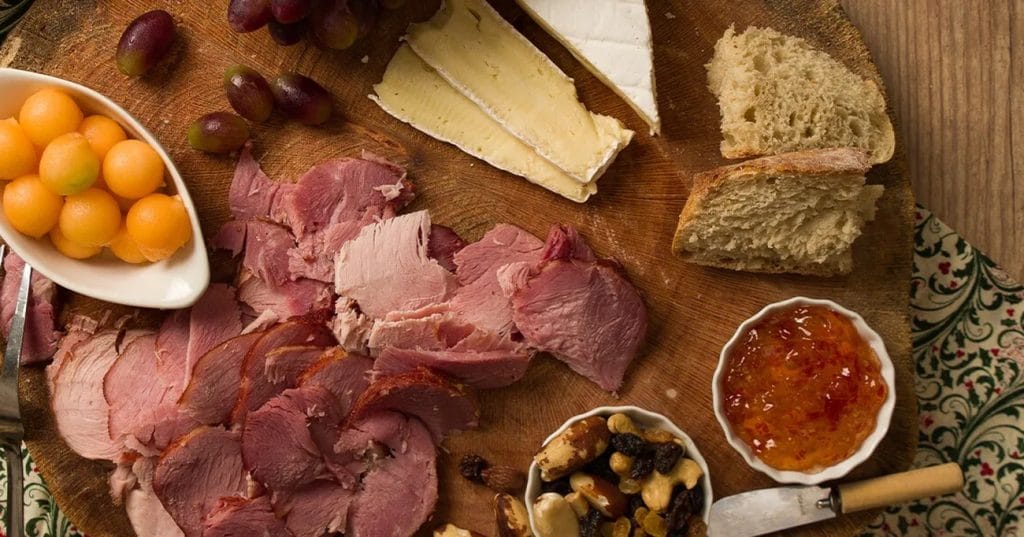 - Agora, é hora de montar a tábua com todos os elementos. Coloque as fatias de tender, o queijo brie, as uvas, o melão boleado, a geleia de pimenta vermelha, os nuts de sua preferência e o pão rústico fatiado de forma harmoniosa e convidativa.