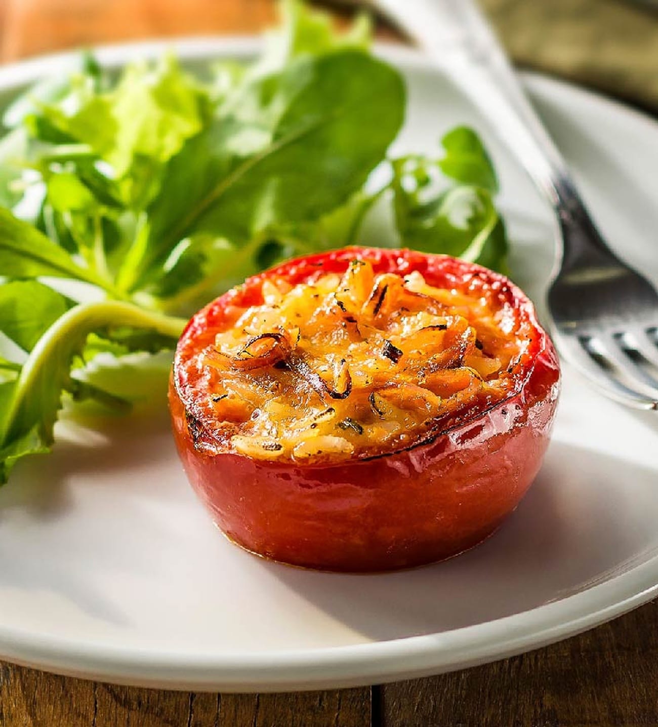 - Recheie os tomates com o arroz cremoso, coloque a tampa do tomate no lugar e asse em forno pré-aquecido em 180ºC por 10 a 15 minutos, ou até que esteja bem quente.