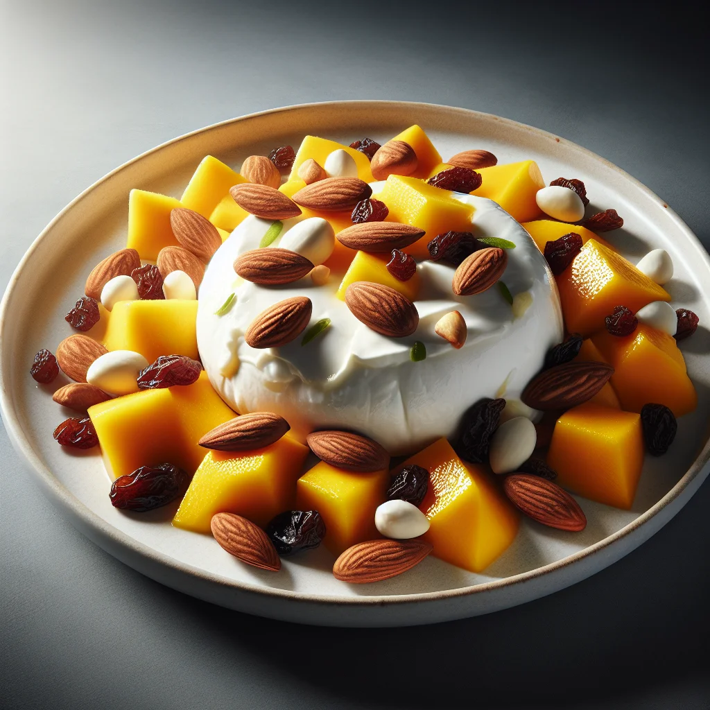 “Reveillon Luxuoso: Salada de Burrata com Manga, Amêndoas Tostadas e Uvas Passas”